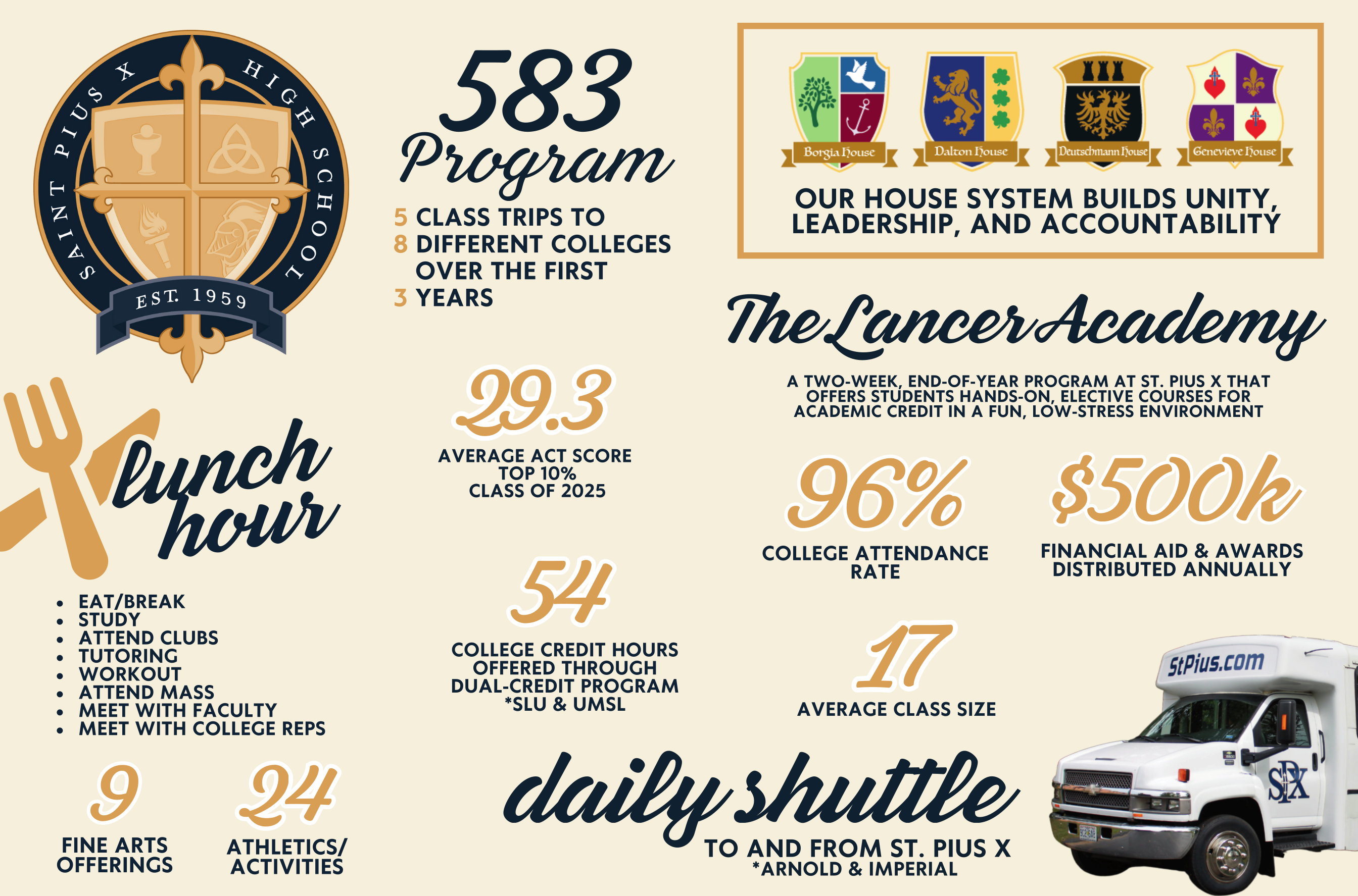 St. Pius X enrolls transfer students throughout the year. Contact Breanna Bannes '15, Director of Admissions, at (636) 931-7487, ext. 117 or bbannes@stpius.com for more information regarding transferring to St. Pius X.