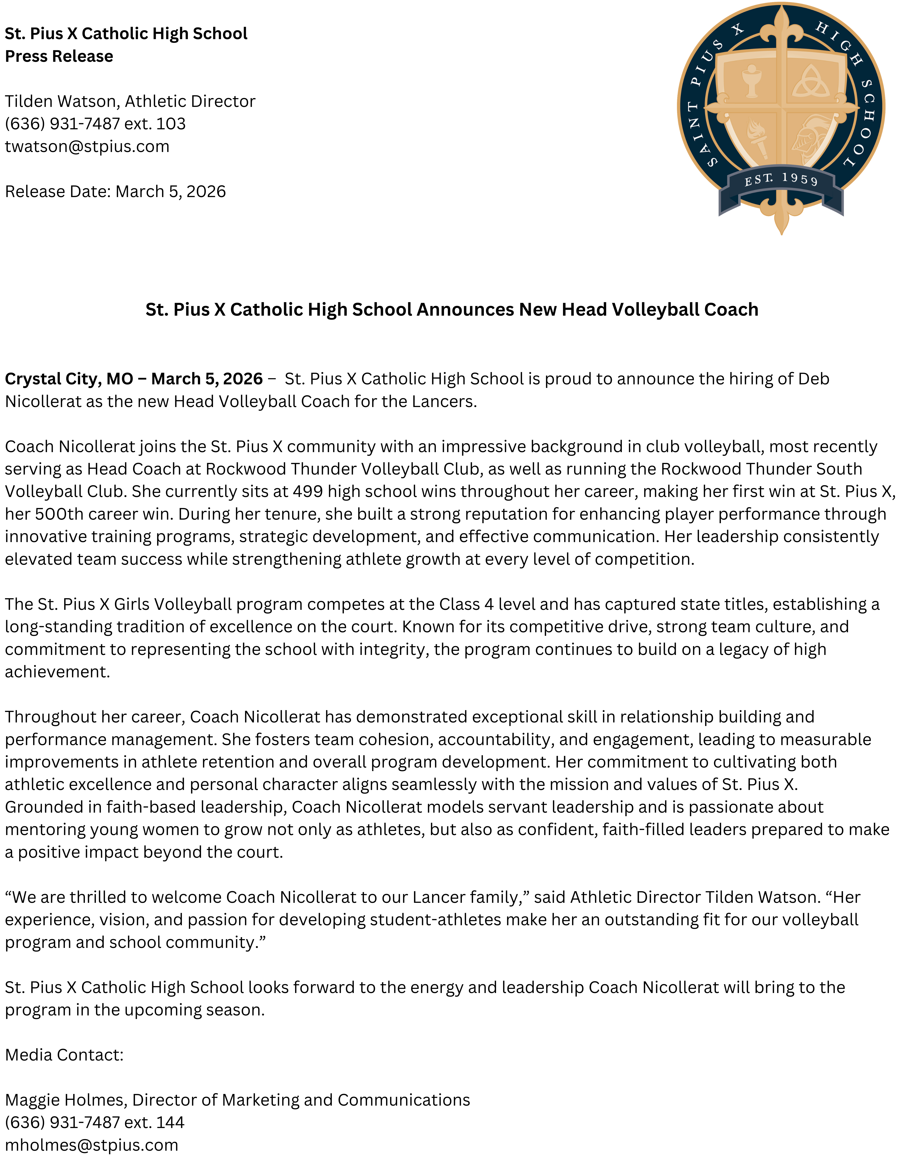 Festus, MO—St. Pius X High School has announced changes for the coaching staff for the 2019-20 school year.